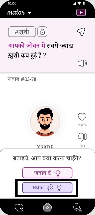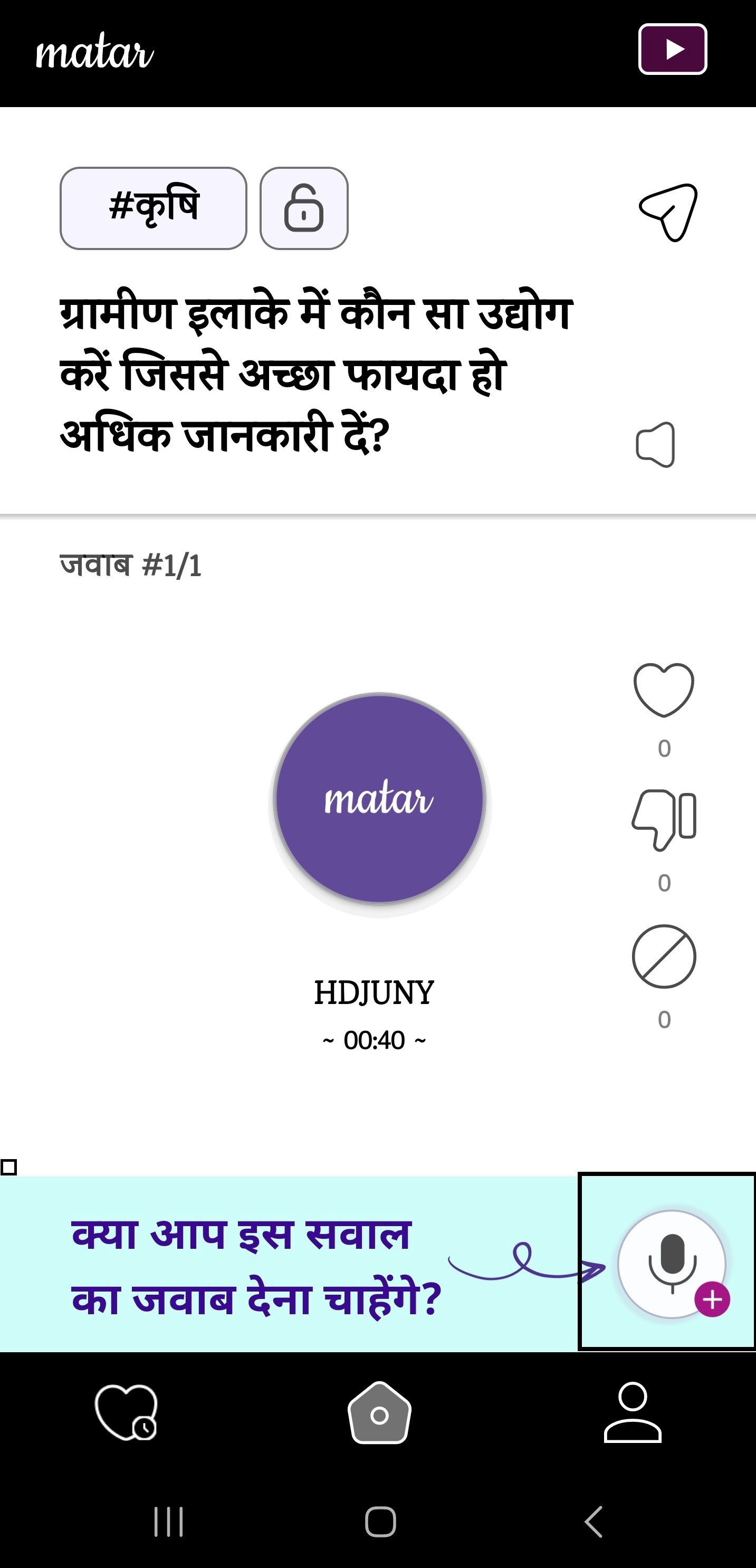 In the Matar App to ask a question. Click the Mic button on the home page of the app.The mic button is highlighted in black box in the screenshot below: